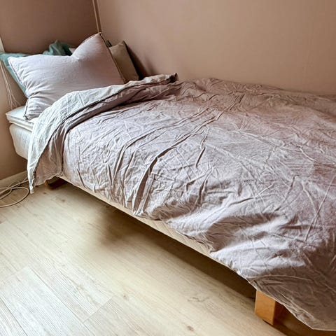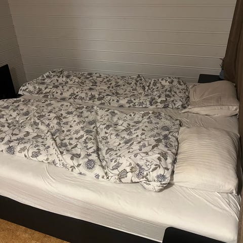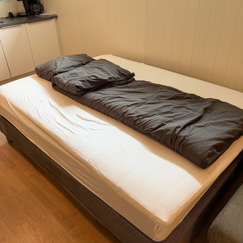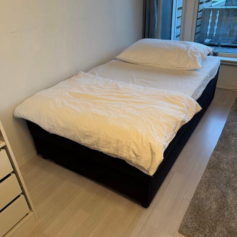 Sengen består av en overmadrass med vaskbart trekk, en vendbar mellom madrass og en polstret ramme med svarte treben (som enkelt kan byttes).