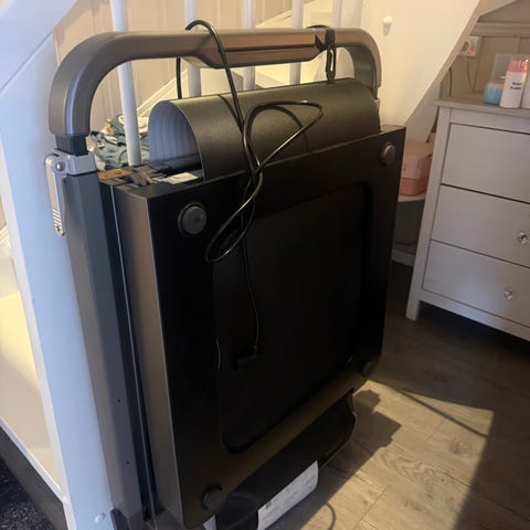 WalkingPad R2 Pro tredemølle med sammenleggbar design. Utstyrt med digitalt display for hastighet og tid. Kompakt og bærbar, egnet for hjemmebruk og trening i små rom.