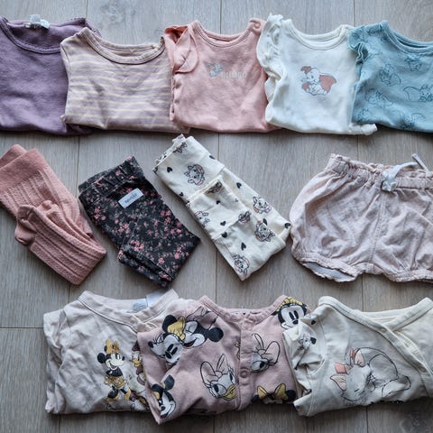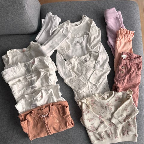 6x bukser, 5x bodyer, 2x sommerbody, 2x luer, 2x ullabber, 1x genser og 2x kortermet pysjamas 🌸