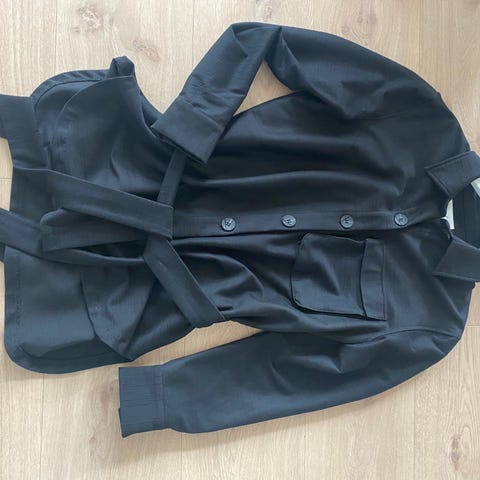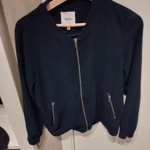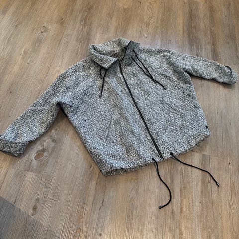 OBJECT jakke for dame i størrelse M. Jakken er grå (polyester). Modellen har løs passform med glidelås i front, høy krage med snøring og lommer i sidene. Egner seg som ytterjakke i overgangssesonger eller på kjølige dager.