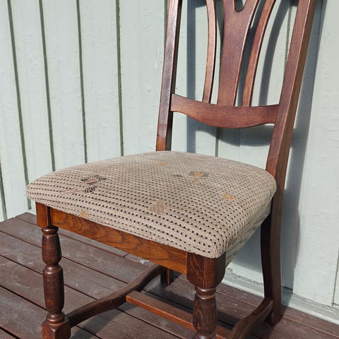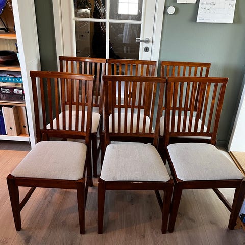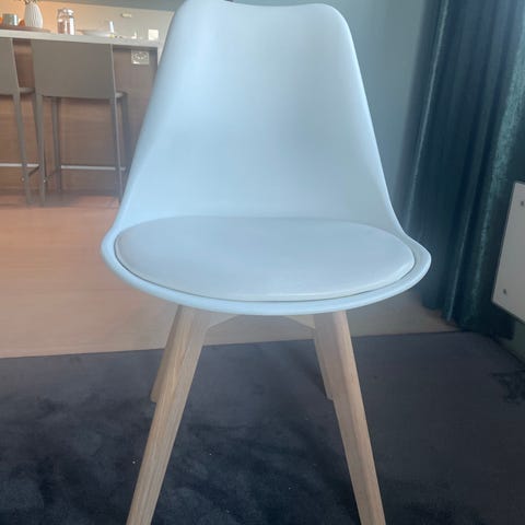 Plast med pute i kunstskinn. Føtter i heltre. Stolene er hele og i god stand. Selges samlet og må hentes på Nardo i Trondheim.