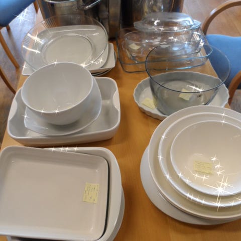 Selger ulike kjøkken- og pyntegjenstander – vaser, glass, skåler, tallerkener,