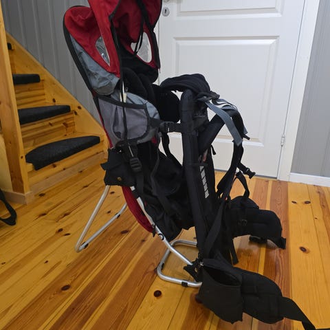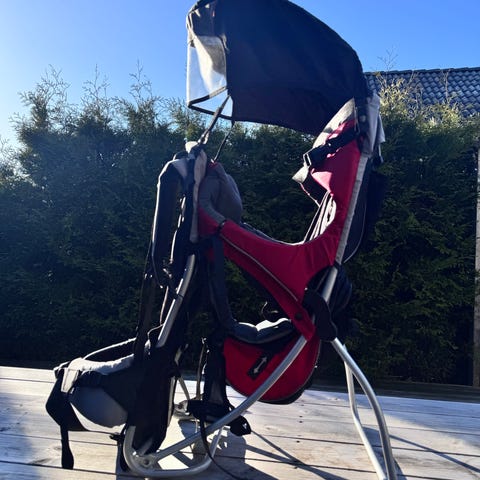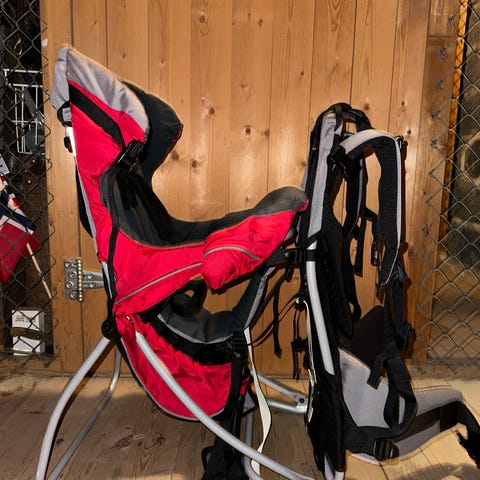 Bergans 2300 Trekking Child Carrier bæremeis i rød og svart. Modellen har integrert solskjerm og bæresystem med polstrede skulderstropper og hoftebelte. Metallramme gir stabilitet når meisene settes fra seg på bakken. Justerbare stropper og seler for å sikre barnet i setet. Egnet for tur og hverdagsbruk der barnet bæres på ryggen.