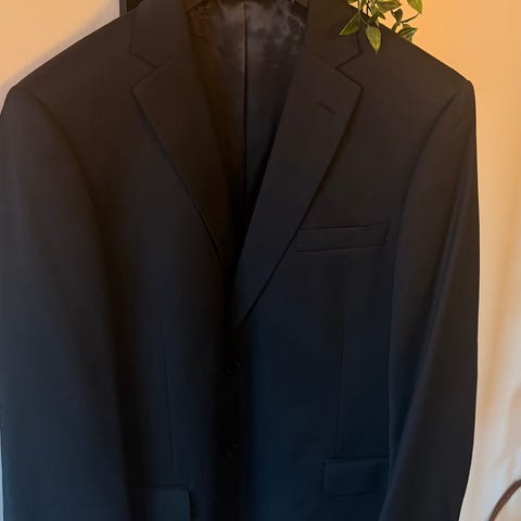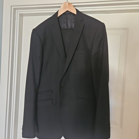 Lapious svart herredress i størrelse 54. Dressen består av jakke og bukse i 100 % ull (virgin wool) med fôr i polyester. Klassisk, ensfarget svart modell med to-knapps jakke og bukse med press. Egnet som penklær til formelle anledninger, jobb eller selskap. Rens anbefales i henhold til vaskeanvisning på lappen.