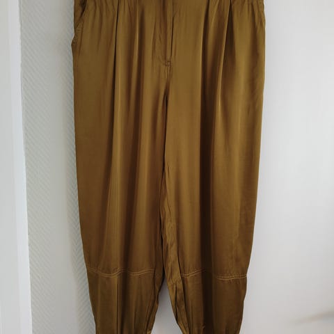 Masai bukser for dame i størrelse L. Buksene er svarte og laget i viskose. Modellen har elastisk linning og fin på med knappdetaljer nederst. Passer til hverdagsbruk og kan kombineres med ulike topper og sko for et enkelt og nøytralt uttrykk.