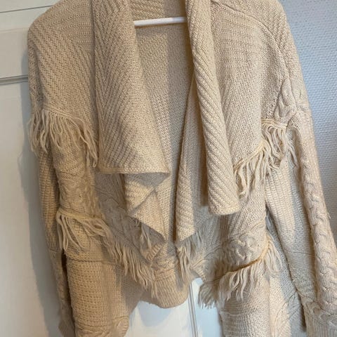 Noisy May cardigan for dame i størrelse M. Strikket i ullblanding i beige farge med ribbestruktur. Modellen har v-hals, tre knapper foran og litt puffede ermer med 3/4-lengde. Passer som et lett og varmt lag over topper, skjorter eller kjoler i hverdagen.