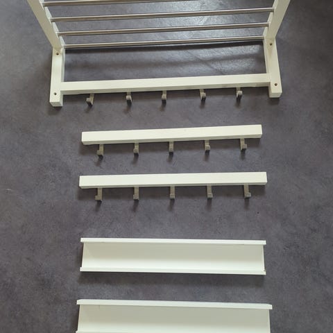 Hengerne har krokrekke i metall med flere kroker per list. Egnet til oppheng av klær, vesker eller tilbehør på dør eller vegg.