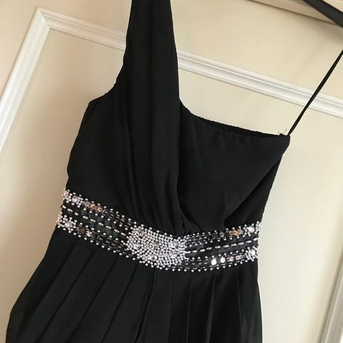 Dette er en eksklusiv occasion-kjole: 100% silke som base og et tett, håndbrodert dekorpanel i front som gir et tydelig high-end uttrykk.