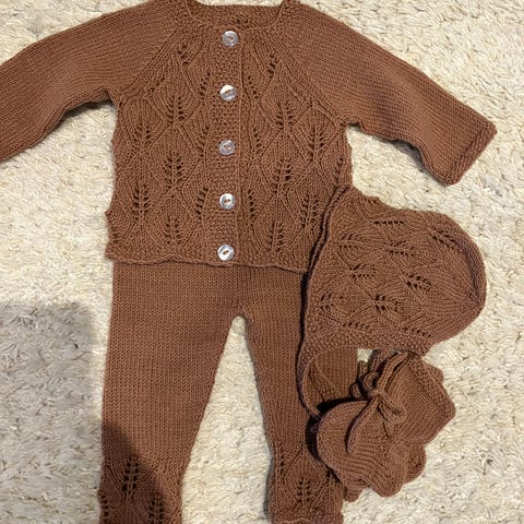 Lue , jakke og bukse strikket i viking garn alpaca liten storm ( babygarn) farge beige