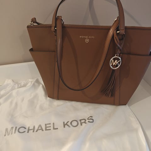 Michael Kors skinnveske for dame i brunfarge. Vesken er laget i mykt lær med struktur og har doble hanker for bæring på skulder eller i hånden. Den har glidelåslukking på toppen og metall-detaljer i gullfarge. På siden er det dekorativ dusk i skinn. Passer som hverdagsveske med plass til nødvendigheter som lommebok, mobil og småting.