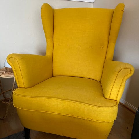 Gul ørelapp stol selges rimelig fra dødsbo. (Litt dårlig belysning på bildene så fargen ikke helt korrekt…)