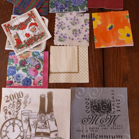 Papirservietter i ulike mønstre og farger.