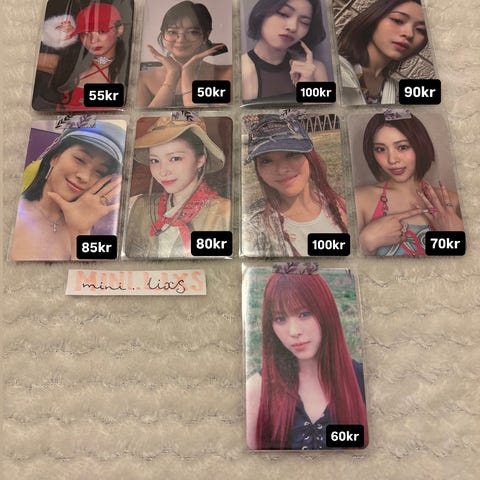 Bildet inkluderer photokort fra enhypen og le sserafim