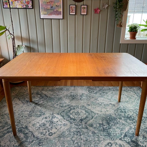 Nydelig teak spisebord, noen bruksmerker og en ripe på ene utreklsplaten (se bilder), men det meste kan nok fikses med litt puss og teakolje.