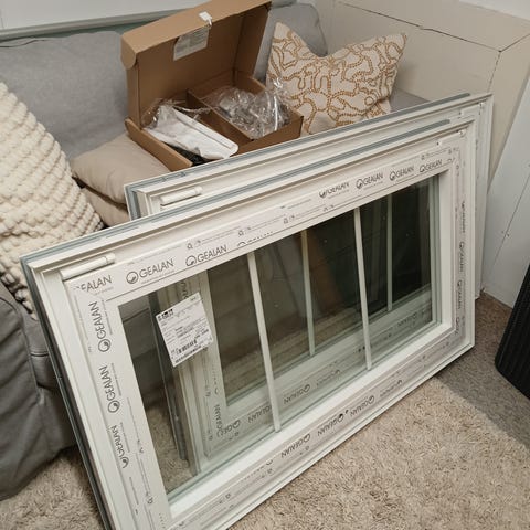 Hvitt vindu med fire felter, hvor begge to er åpningsvinduer sammen. Vinduet har hvit karm og rammer i moderne stil. Glassfeltene er smale og høye, egnet for montering i yttervegg på bolig eller hytte. Monteringsskum er synlig langs kanten og må fjernes eller tilpasses ved ny montering.