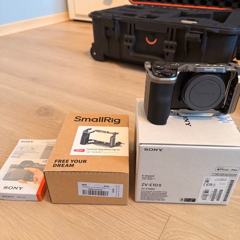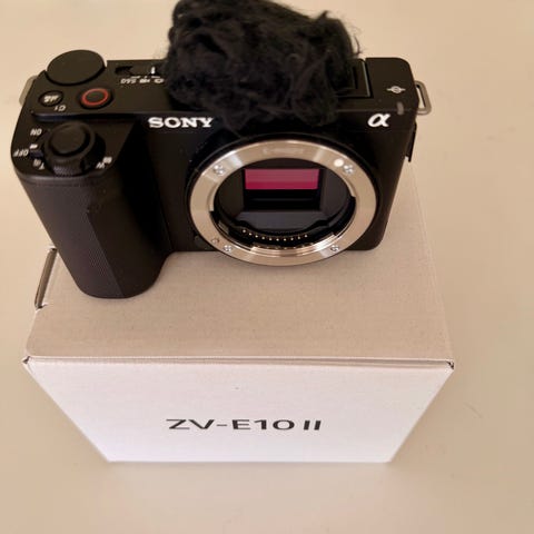 Sony ZV-E10 systemkamera i svart. Kamerahuset har utskiftbar optikk (E-fatning) og er tilpasset video og vlogging med egen REC-knapp, toppmontert retningsstyrt mikrofon og medfølgende vindskjerm. Baksiden har vridbar LCD-skjerm som kan vendes fremover, samt betjeningshjul og funksjonsknapper. På siden finnes tilkoblinger for mikrofon, hodetelefon, USB og HDMI. Kameraet er egnet for både foto og videoopptak med ulike E-mount-objektiver.