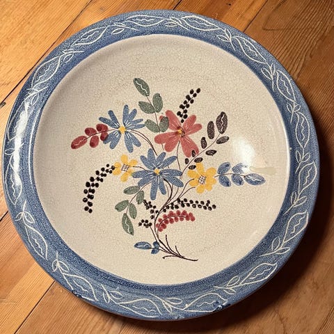Flott, vintage fat i keramikk, Åros, med håndmalt blomstermønster i blått og gult på lys glasur. Rund form med svakt opphøyd kant. Baksiden er merket med tall. Egnet som serverings fat eller dekorativt fat. Ingen skader.