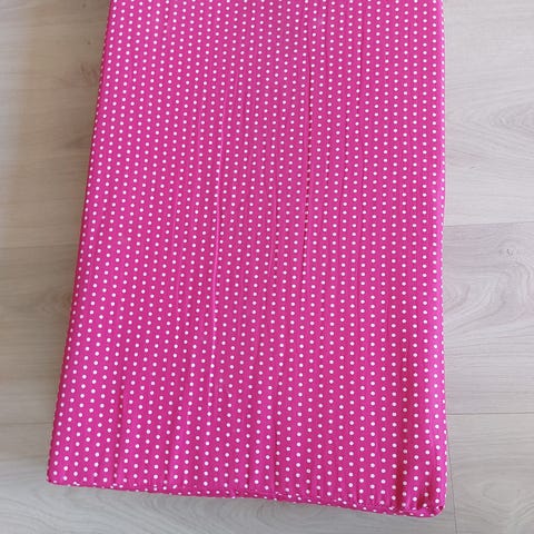 IKEA oppbevaringslomme til barneseng i rosa tekstil. Henges over sengekant og har flere lommer i ulike størrelser for oppbevaring av for eksempel bøker, tegnesaker eller småleker.