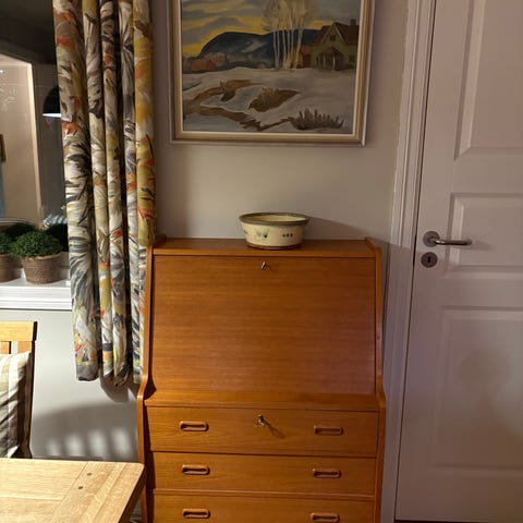 Veldig fin vintage skjenk i teak med hyller, utdragbar pult og skap. I tillegg er det 3 små skuffer. Masse lagringsplass og ser flott ut:)