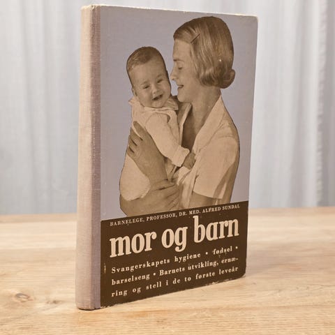 "Mor og barn" bok om svangerskap, fødsel, barseltid og spedbarnstell. Boken tar for seg svangerskapets hygiene, fødsel og barselseng, samt barnets utvikling, ernæring, stell og pleie i de to første leveår. Utgitt av Norges Husmorforbunds Mødrehjelp og Røde Kors Barnehjelp. Egnet som fag- og oppslagsbok om morskap og småbarnsomsorg i tidlig barnealder.