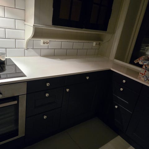 Det er er fin Kjøkkeninnredning i hvit utførelse med klassisk profilerte fronter og heltre benkeplate. Løsningen består av både over- og underskap, Det er integrert platetopp og stekeovn, samt ventilator under overskap.