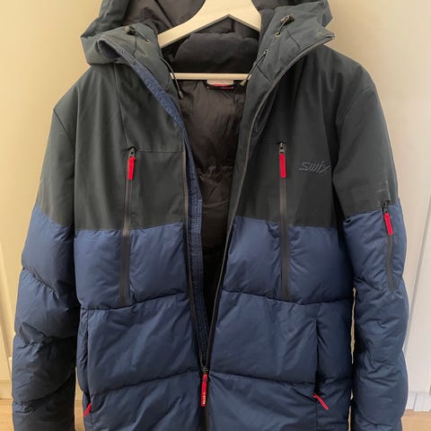 Swix vinterjakke i dun for herre, størrelse M. Jakken er svart og har vatterte dunpaneler som gir god isolasjon. Den har avtagbar hette, høy krage og glidelås i front. Yttermaterialet er glatt og glansfullt, med Swix-logo på brystet og merke på ermet. Passer som varm ytterjakke i kaldt vær og til bruk på vinterstid.