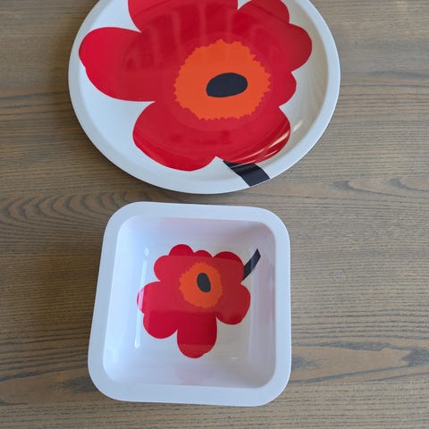 Marimekko Unikko servise med rød blomstermotiv. Settet består av én firkantet skål og fire små eggeglass i samme mønster. Designet har hvit bunnfarge med røde og oransje blomster. Egner seg til servering av frokost, snacks eller som tilbehør på bordet. Produsert i samarbeid med Zak! Designs, materiale er plast/melamin basert på pregingen under skålen.