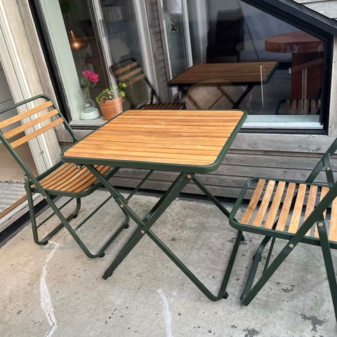 Balkongsett med sammenleggbart bord og to sammenleggbare stoler i tre og metall. Bord og stolseter/rygger består av trelameller, mens understell er i metall. Egnet for bruk på balkong, terrasse eller mindre uteplasser.