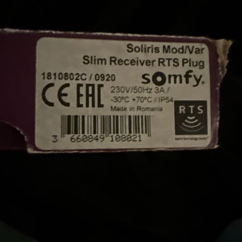 Mottakeren er beregnet for styring av Somfy io-systemer. Den har spesifikasjon 230 V / 50 Hz, 3 A og kapslingsgrad IP54. Driftstemperatur er oppgitt til -30 °C til +70 °C. Produktet er merket med io-homecontrol og er produsert i Romania.