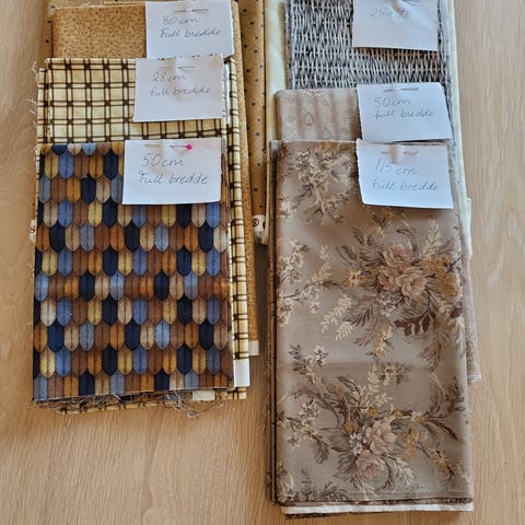Stoffpakke med ulike typer metervare i koordinerte gule, oransje, brune og mørkegrønne toner. Pakken inneholder flere stoffbiter i bomull med både ensfargede og mønstrede flater, samt et stykke som ligner imitert skinn eller korkstruktur. Det følger også med noen smalere stoffremser og en snor som kan brukes til detaljer eller lukking. Egnet til søm- og hobbyprosjekter som små vesker, toalettmapper, patchwork eller andre kreative tekstilprosjekter der man ønsker varme jordfarger og ulike strukturer i stoffene.