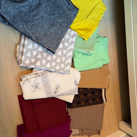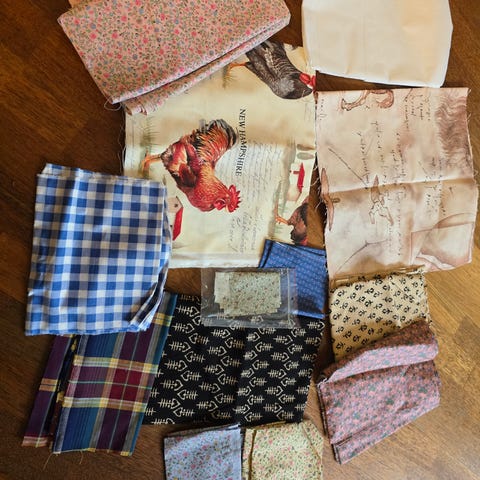 Tror jeg tenkte dette til å sy noen påske-pynt en gang. Det gule stoffet er brukt litt av, se bilde.