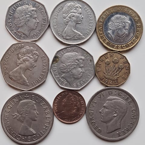 Samling britiske mynter i blandede valører og størrelser. Myntene er i ulike metaller og farger, blant annet sølvfargede, gullfargede og kobberfargede varianter. Flere av myntene har samme motiv på forsiden og tilhører ulike serier og årganger. Egner seg som tillegg til myntsamling eller for den som ønsker et utvalg britiske sirkulasjonsmynter til sortering og gjennomgang.