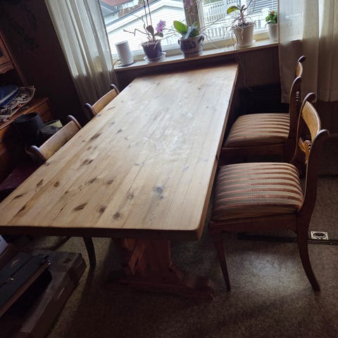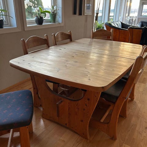 Spisegruppe trebord med benk og stoler furu