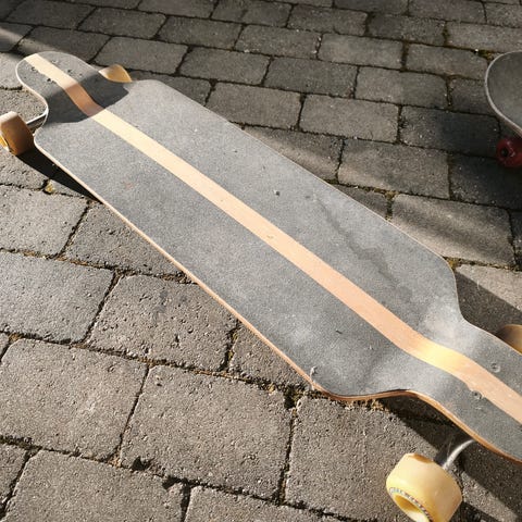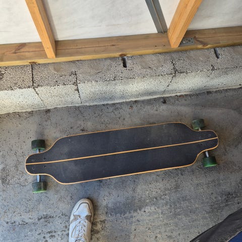 Longboard med grovt grep på oversiden og grafisk mønster på undersiden i oransje, røde og mørke toner. Brettet har utsvingte hjulbrønner for å redusere hjulbitt og er utstyrt med lilla hjul og standard trucker. Egnet for cruising og pendling på asfalt og andre jevne underlag.