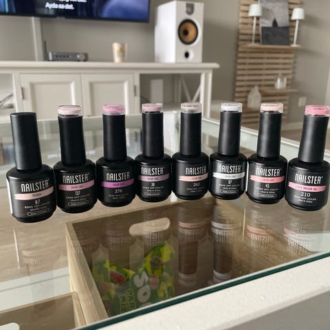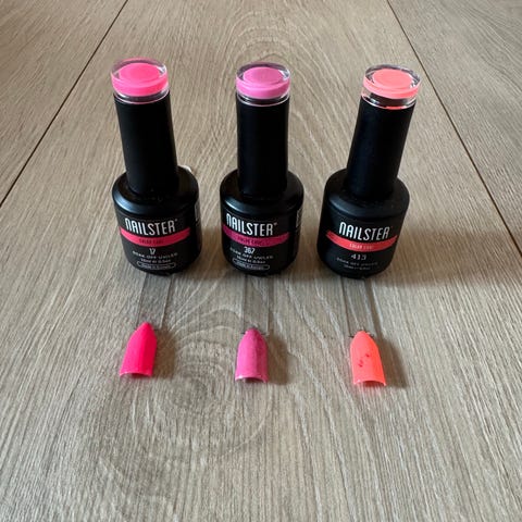 Ulike rosa- og nude-nyanser, lakk til legging av negler med bruk med UV/LED-lampe. 2 av flaskene har samme farge "nudist", så den er det 2 av. En av disse er litt brukt og den andre helt ny. Fargene spenner fra lyse nude-toner til mer markerte rosanyanser og rød farge. I tillegg er det en base coat i samlingen.