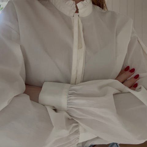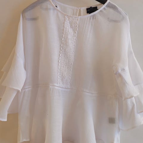 Cider bluse for dame i størrelse M. Blusen er hvit. Modellen har lange ermer med mansjetter og høy hals med knyting i front. Stoffet fremstår lett og noe gjennomsiktig, egnet til bruk med topp eller singlet under. Passer til hverdagsbruk eller mer pyntede anledninger, kombinert med for eksempel jeans, skjørt eller dressbukse.