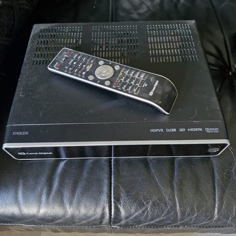 På baksiden finnes tilkoblinger som HDMI-utgang, nettverk (Ethernet) og koaksial digital lydutgang. Enheten leveres med fjernkontroll.