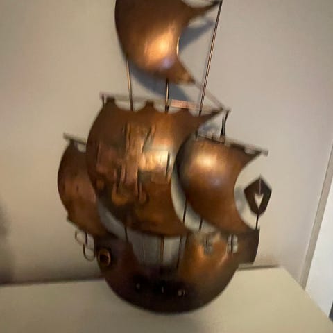 Modellskip seilskip i tre. Skipet har flere master med seil og rigg, og står på en enkel sokkel. Detaljert utførelse med malte skrogdetaljer og dekorelementer på seilene. Egnet som dekorasjonsgjenstand i hjem eller hytte, for eksempel på hylle, skjenk eller peisinnramming.