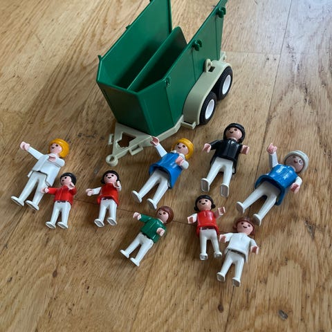 Playmobil bil med to figurer og tilbehør. Lekesettet består av en større bil i plast med bevegelige hjul og dekor på karosseriet. Det følger med to Playmobil-figurer kledd i utstyrt bekledning, samt et lite ekstra tilbehør. Egnet som lekesett for barn som liker kjøretøy og figurlek.