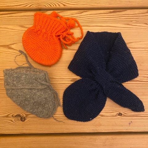 Selger en pakke med luer. Blå lue I merinoull fra nøstebarn / joha. Brun lue er hjemmestrikket