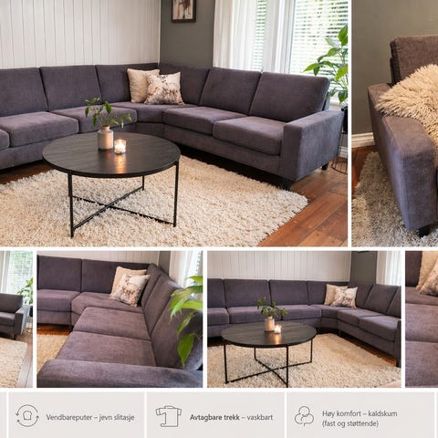 Malte hjørnesofa med sjeselong og endeavslutning selges videre til en som trenger den.