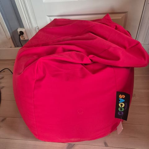 Fin stor stoffdekket sacco-stol med rygg. Har to. 400,- per stykk.