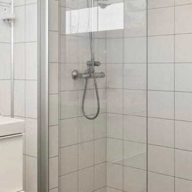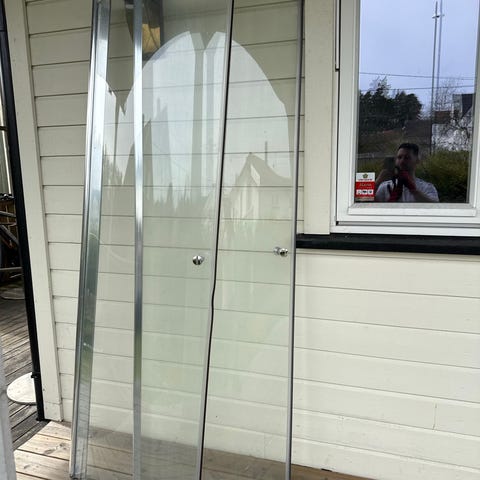 Dusjvegg i klart glass med aluminiumsprofiler. Består av rette glassfelt med tilhørende profiler for montering mot vegg og eventuelt gulv. Egnet for montering i dusjsonen på bad, for å skjerme mot vannsprut og avgrense dusjområdet. Passer til baderom med flislagte eller tilsvarende vegger der dusjvegg kan festes med skruer i profilene.