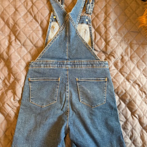 Selges samlet H&M selebukse shorts for barn i størrelse 128. Unisex-modell i blå denim. Shortsen har justerbare seler, brystlomme foran og sidelommer. Praktisk jeansstoff som egner seg til hverdagsbruk. Laget i denim-materiale med klassiske jeansdetaljer som knapper og sømmer.