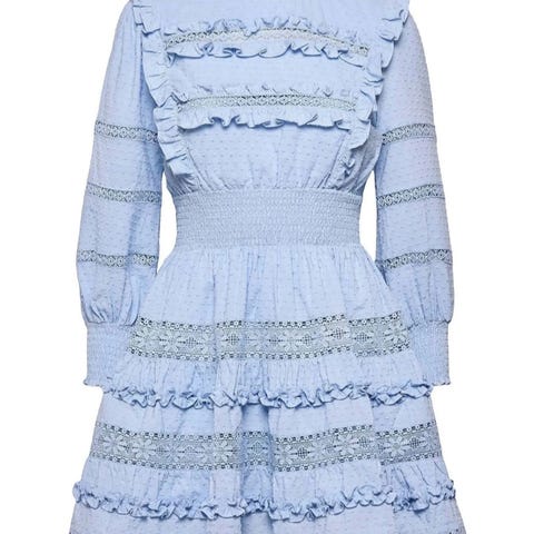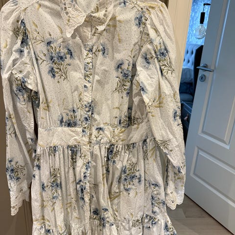 By Malina kjole størrelse L. Kjolen er grå med broderte detaljer på overdel, ermer og nederkant. Kjolen har lange ermer med volum, knappelukking foran og tilhørende belte i samme stoff. Skjørtet har volangkant nederst.