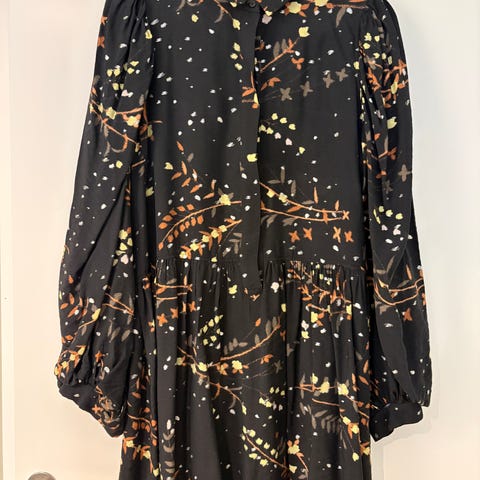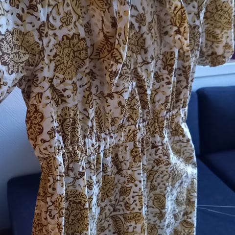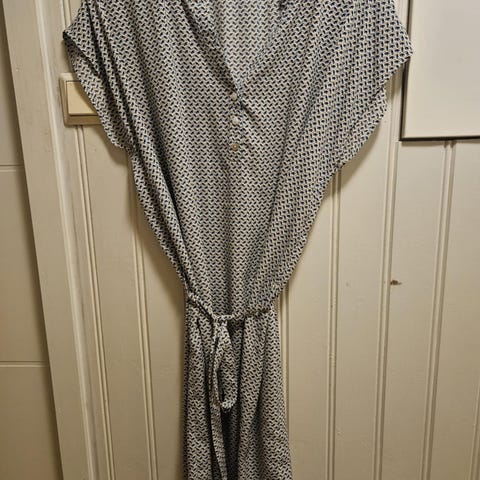 Munthe hverdagskjole i størrelse 42 for dame. Kjolen er laget i viskose og har et flerfarget geometrisk mønster. Den har korte ermer, v-utringning med volangdetaljer og markert midje med strikk og knytebelte. Passer til hverdagsbruk og enkle anledninger.