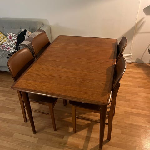 Teak spisebord med fire stoler og to klaffer