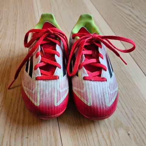 Pent brukt Adidas fotballsko for barn i hvit farge med blå detaljer str 31. Yttersåle med faste knotter i blått og hvitt, egnet for spill på gress eller kunstgress. Passer til barn som trenger lette fotballsko til trening og kamp.