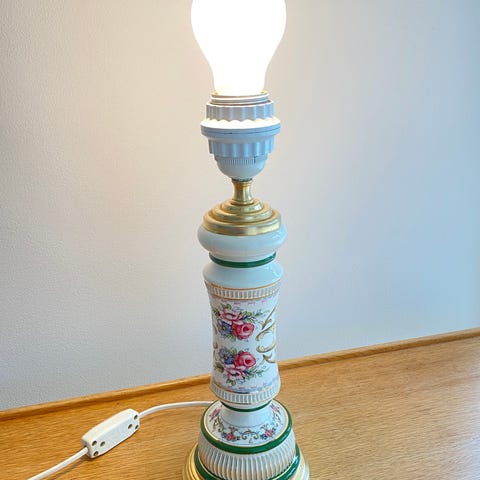 Helt nydelig og dekorativ bordlampe med blått mønster og fuglemotiv, ligner på Chinoiserie-stil. Messing-detaljer. Kjøpt på bruktbutikk. Selges fordi vi har ommøblert og dessverre ikke har plass lengre. Fin både med og uten lampeskjerm.