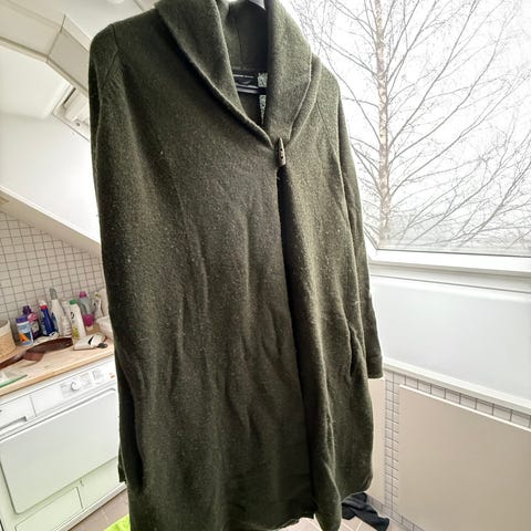 Svart og fin kappe. En knapp har falt av og jeg vet ikke om den kan repareres/loddes.